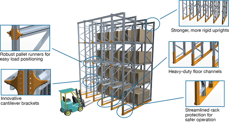 By using ledges instead of beams, forklifts are able to drive into the empty rack locations, which makes the storage of multi-deep pallets possible and eliminates aisles, allowing for remarkably dense storage.